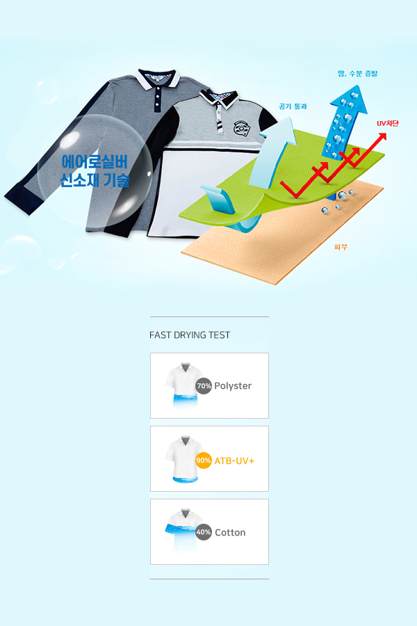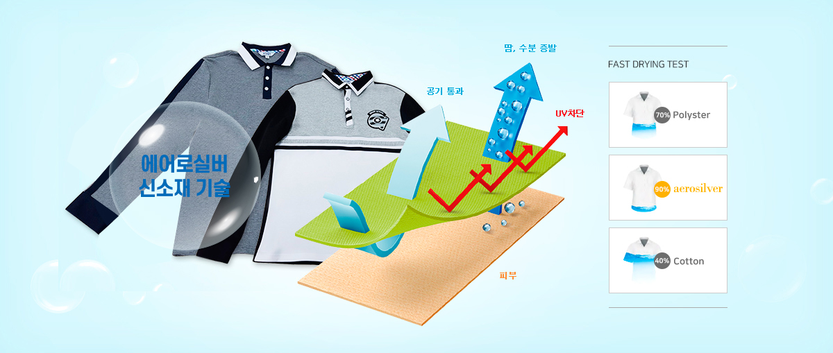 스포츠웨어 원사 ‘에어로웜'은 원사 내부의 공기층 형성으로 체온을 따뜻하게 유지합니다.